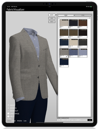 ・オーダースーツ事業者様:オンライン注文サイトにお組み込み頂く、または店舗にてお客様に生地をご提案される際にiPadにてご利用頂くことで、スーツの出来上がりに関するお客様のイメージギャップを防ぎ、成約率やリピート率の向上が期待できます。