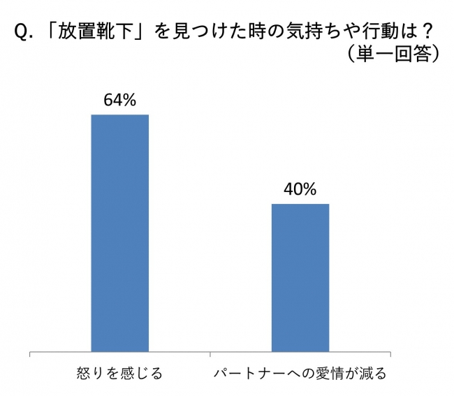 そこで、「放置靴下」を見つけた時の気持ちや行動をきくと、64%が「怒りを感じる」、40%が「パートナーへの愛情が減る」と回答。