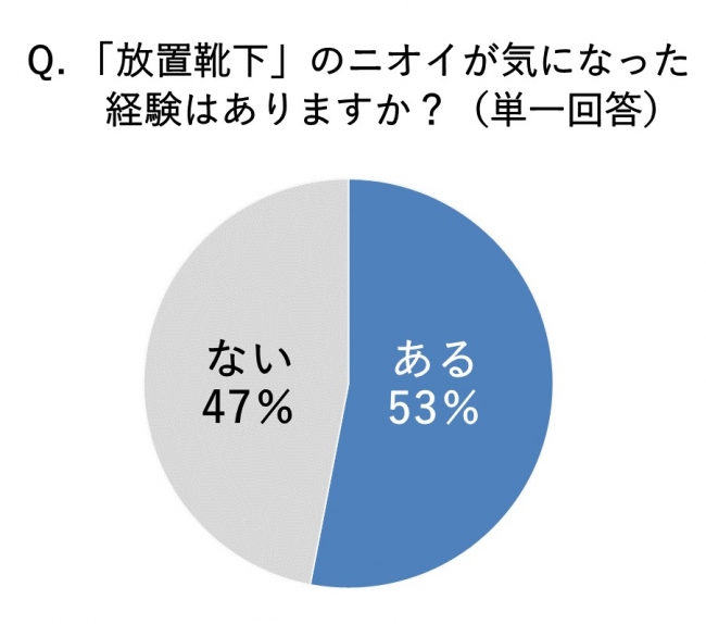 共用スペースに堂々と放置されていたり、見つかりづらいふとんの中にあったりと、「放置靴下」は実に様々な場所に潜んでいるようです。特に、そのニオイに関しては、53%が「気になった経験がある」と回答。