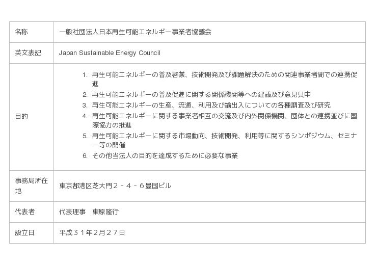 このたび、一般社団法人日本再生可能エネルギー事業者協議会(英文表記:Japan Sustainable Energy Council、略称「JSEC」)(事務局:東京都港区芝大門豊国ビル2-4-6、代表理事:東原隆行)が、140に及ぶ法人・個人の賛同により設立されましたことをお知らせします。