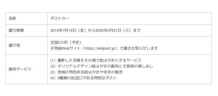 日本郵便株式会社(東京都千代田区、代表取締役社長 横山 邦男)は、手紙交流の価値を見直し、新たな可能性を探るプロジェクト「& Post(アンド・ポスト)」の一環として、2019年7月19日(金)から、日本各地の「絵はがき映えする」風景を巡る移動型郵便局『ポストカー』の運行を開始します。