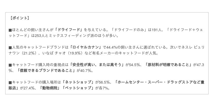 「その他」の回答には、モグニャン、カナガン、アカナ、アーテミスなど、肉や魚などの原料にこだわったプレミアムキャットフードの銘柄も多く見られました。