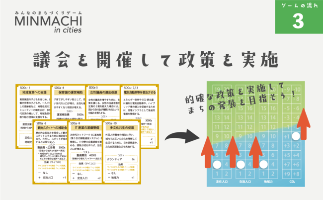 ・ゲームをプレイするだけで、地域経済や、地域とSDGsの関わり、人口と環境など、まちづくりの要素が自然と体感できます。