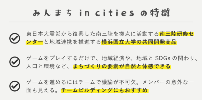 今回開発した「みんなのまちづくりゲーム in cities」(以下、みんまちin cities)は、2015年に南三陸研修センターが販売開始した「みんなのまちづくりゲーム」(以下、みんまち)を改編して開発された商品です。