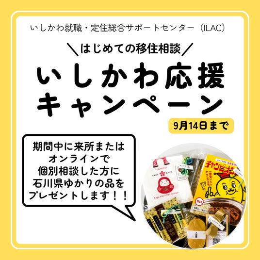いしかわ就職・定住総合サポートセンター(ILAC/石川県金沢市)では、9月14日(土)まで「はじめての移住相談 いしかわ応援キャンペーン!」を実施中です。石川・東京・大阪の各拠点またはオンラインの無料相談窓口で、移住やUIターン転職に関する相談をした方に石川県ゆかりの品をプレゼントします。 ILACの相談窓口では、石川県の地域情報・企業情報に精通した相談員が、「能登半島地震後の石川県の状況」や「石川県の企業への転職の進め方」といったさまざまな不安や疑問にお答えしています。この機会に、ぜひご利用ください!