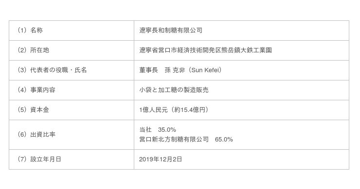 三井製糖株式会社(本社:東京都中央区、社長:雑賀大介、以下「当社」)は、昨年の中糧糖業遼寧有限公司(本社:遼寧省営口市、以下「中糖遼寧」※1)への出資参画に続き、この度家庭用小袋や各種加工糖の製造販売を目的とする新たな合弁会社を設立いたしましたので下記のとおりお知らせいたします。