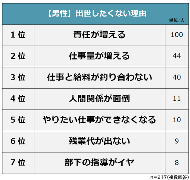 出世したくないと思う男性217人に「出世したくないと思う理由」を聞いたところ、1位は「責任が増える(100人)」でした。