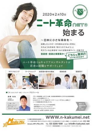 株式会社メディアミックス(本社:東京都新宿区 代表取締役社長:高橋和裕 以下「当社」) は、ニートな状況にある若者や一歩を踏み出せない若者向けの就職支援サイト&就職支援 活動「ニート革命」を、2020 年 2 月 10 日より開始いたしますので、下記のとおりお知らせ いたします。