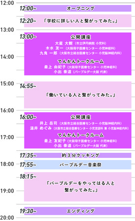 てんかん情報をYouTube Liveで8時間の配信。市民公開講座や質問コーナーをはじめ、てんかん児の教育現場での受け入れをテーマにしたトークコーナー「学校に詳しい人とつながってみた」、てんかんを持ちながら就労する方とのトークコーナー「働いている人と繋がってみた」、てんかんを啓発する皆様と中継でオンライントーク。他にはパープルデー大阪の活動に参加した学生による音楽やミニコーナーも。