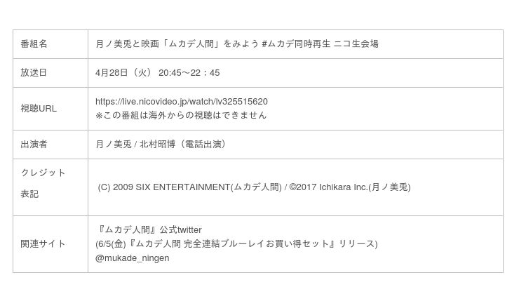 昨今の社会情勢のなか、当初開催が予定されていた映画館での『ムカデ人間』作品シリーズ一挙上映などのイベントが中止になったことを受け、それぞれの場所から“みんなでつながる”同時再生祭が開催されることになりました。このたびニコニコ生放送では、本編映像とともに、自身の出演する公式ニコ生で”ムカデ人間スタイル”で放送をしていたバーチャルライバー・月ノ美兎が出演し、本編を同時視聴。ハッシュタグ 「#ムカデ同時再生」をつけたツイートも紹介しながら番組を盛り上げます。また、第1作目の主演俳優・北村昭博もビデオ通話で出演し、”ムカデ人間オールスター”の布陣で番組をお届けします。