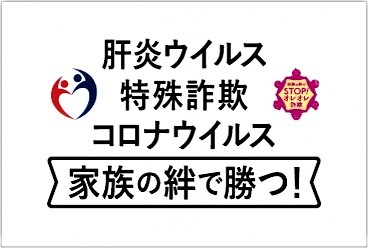 肝炎ウイルス検査の受検促進を普及啓発している厚生労働省 肝炎総合対策推進国民運動「知って、肝炎プロジェクト」は、このほど警察庁の「ストップ・オレオレ詐欺47~家族の絆作戦~」プロジェクトチーム(略称:SOS47)と共同で広報啓発を行うこととし、そのための広報啓発用ステッカーと貼付用マスク50万枚を用意し、全国老人福祉施設協議会加盟の介護施設(約11,000施設)、緊急小口資金等貸付の窓口である市町村社会福祉協議会(約1,700箇所)や全国労働金庫協会、全国47都道府県警察に向け5月中に配布を開始することになりました。