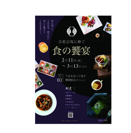 今回、その一環として、柳川市内の老舗旅館や隠れた名店など7店舗が、宗茂公や誾千代姫に想いを馳せ 、 開発した飲食メニューやお弁当、スイーツ など の商品を巡る回遊型企画「立花宗茂に捧ぐ食の饗宴2022」を 柳川雛祭り「さげもんめぐり」合わせて、 2月11日より実施致します。