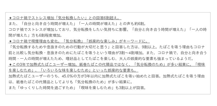 今回の調査では、コロナ禍で気分転換・息抜き需要の高さが改めてわかる結果となりました。また、コロナ禍での一人時間の増加に伴い、たばこは休息のためだけでなく、娯楽的な意味合いが強まってきているようです。特に加熱式たばこにおいては加熱式たばこの喫味自体や、様々なフレーバーを楽しむといった娯楽的な要素も求める声が増えていることがわかりました。加熱式たばこは紙巻たばこの代替品としてではなく、嗜好品として能動的に楽しむものへと位置づけが変化しているのかもしれません。加熱式たばこへのニーズが、コロナ禍を含んだ時代の流れに合わせて、変化していることが伺われます。今後、「休息」と「娯楽」は喫煙の変化を追う上でのキーワードとなりそうです。