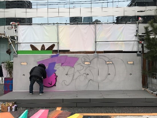 1960年代にニューヨークではじまったとされる“グラフィティアート”は、ニューヨークやパリなど、世界各国で見ることができます。しかし、規制の厳しい日本においては単なる落書きと見なされることも多く、自由に描ける場を見つけるのは非常に困難です。そのような現状をふまえ、VGJは、「新虎ヴィレッジ」内に、グラフィティアーティストが自由にアートを表現できる高さ1.7mx幅 6mのコンクリートの壁“フリーウォール”を設置しました。1月~3月の設置期間において、総勢15名のアーティストが連日グラフィティアートを描き、色鮮やかな数多くのアートが出現しました。
