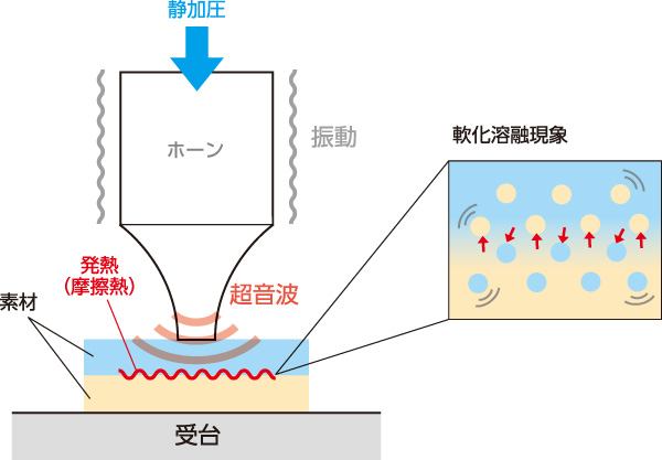 超音波溶着とは、音波振動(20000回/秒)と加圧を素材にかけることにより、接合部に協力な摩擦熱が発生し、樹脂を融合し結合する仕組みです。