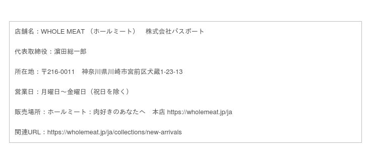 店舗名:WHOLE MEAT (ホールミート) 株式会社パスポート