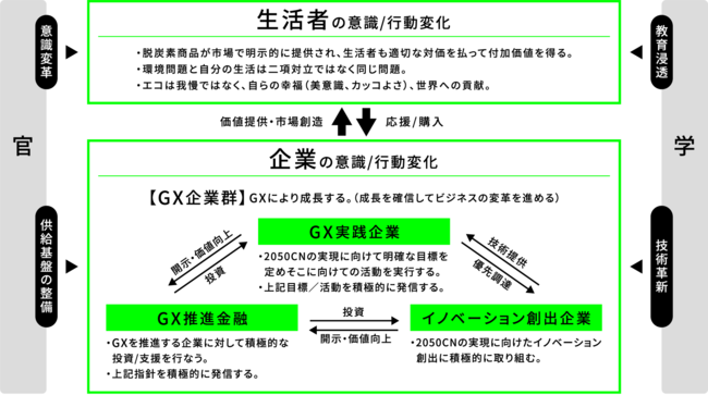 GXリーグとは、カーボンニュートラル・脱炭素社会に向けた経済社会システム全体の変革(GX:グリーントランスフォーメーション)を積極的に取り組む企業と、官・学・金融が協力し、GXの実現に向けた議論や、新たな市場の創造に向けた実践を行う場として経済産業省により設立されました。