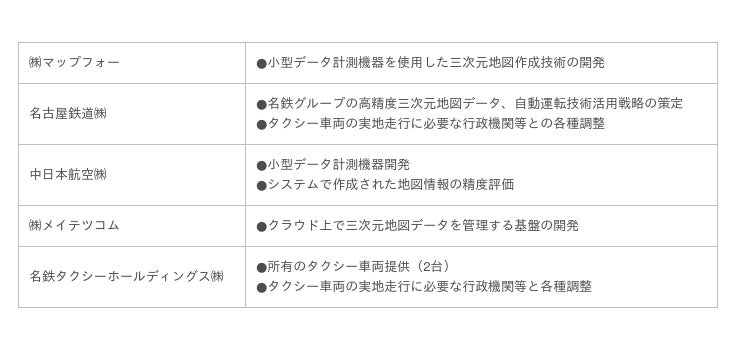 株式会社マップフォー(本社:名古屋市中村区、代表取締役社長:橘川 雄樹)、名古屋鉄道株式会社(本社:名古屋市中村区、代表取締役社長:安藤隆司)、中日本航空株式会社(本社:愛知県豊山町、代表取締役社長:柴田 拓)、株式会社メイテツコム(本社:名古屋市中村区、代表取締役社長:犬塚一広)、名鉄タクシーホールディングス株式会社(本社:名古屋市中川区、代表取締役社長:河原英穂)の5社は、名鉄タクシーホールディングス(株)が所有するタクシー車両を活用して高精度三次元地図※1を作成する実証事業を実施します。