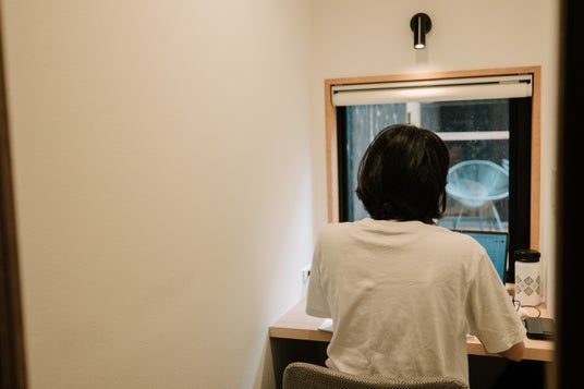 建物の中は、ミニマルで洗練された空間でありながら、木々の温かさを感じられる空間が広がっています。長期滞在でも不便なく生活ができるよう、ワークスペースやキッチンスペースも備えています。
