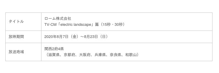これまでロームは長年の音楽支援活動などを通じて、人々に豊かな時間や癒しを届けてきました。いつもと違う夏となっている今年、このTV-CMを通じて多くの人を元気付けたいと考え、再度放映することを決めました。TV-CM「electric landscape」篇(15秒・30秒)は、8月7日(金)から8月23日(日)に関西2府4県で放映されます。