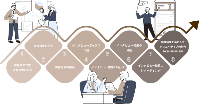 「Marketing Insight Research for レスポンス」はユーザーとの1対1のインタビュー我々が代行し、ユーザーのインサイトを分析します。その結果を基に消費者の直接的な購買行動を促すクリエイティブを作成して、ダイレクトレスポンスを中心としたWeb広告の効果最大化を実現します。