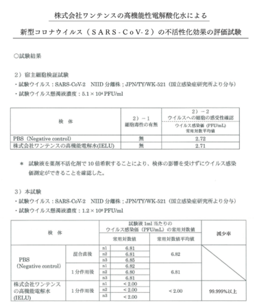 この検証により、ワンテンスの高機能性電解酸化水は、新型コロナウィルス(SARS-CoV-2)に対して1分作用で99.999% 以上不活化することが確認されました。