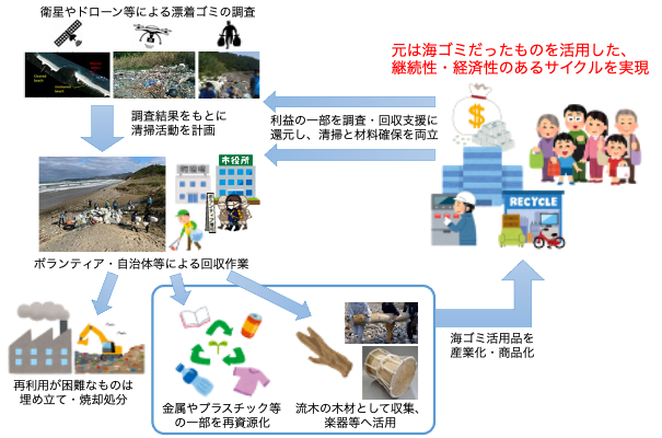 海洋ごみ削減を実現するビジネス社会を目指した「プロジェクト・イッカク」は、日本財団が推進する海洋ごみ対策プロジェクト「海と日本プロジェクト・CHANGE FOR THE BLUE」の一環で開催しています。天の技とドローンクリエイトは、このプロジェクト・イッカクにおいて、海ごみの漂着場所や漂着時期の推定に関する調査・技術開発等に取り組んできました。通常、海岸に漂着している海ごみは、景観維持や更なる環境汚染防止の観点から廃棄物として回収・処理される場合が多く、その労力や費用は地域住民や自治体等の大きな負担や、対処が困難な課題となっています。現在世界的な海ごみ問題に対する関心の高まりを受けて、リサイクルやリユース活動への取り組み、回収・処分・再資源化技術に関する研究開発等が行われていますが、これらを継続的な活動にするためには、経済性のある循環(サーキュラーエコノミー)に組み入れていく必要があると我々は考えています。