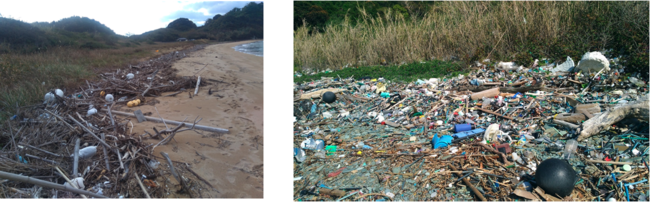 漂着物が大量に堆積している海岸の例