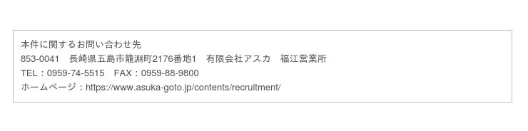 有限会社アスカ(本社:長崎県南松浦郡新上五島町浦桑郷、福江営業所:長崎県五島市籠淵町、代表取締役