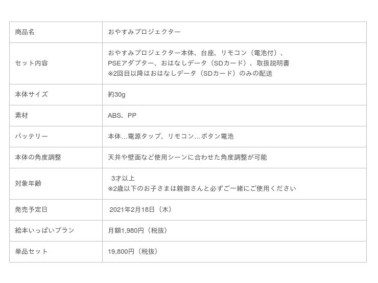 kipkipのサブスクリプションメニューでは月額1,980円(税抜)から「おやすみプロジェクター」をご利用できます。初月にプロジェクター本体と20作品のおはなしを収録したSDカードをお届けします。サブスクリプション会員には定期的に10~15作品の絵本を収録したSDカードをお届けし、継続的にアップデートされる睡眠、知育、情操教育を促すコンテンツを楽しめます。