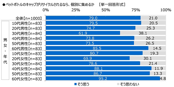 全回答者(1,000名)に、ペットボトルのキャップがリサイクルされるなら、個別に集めるかどうか聞いたところ、「そう思う」と回答した人の割合は79.0%となりました。大半の人は、キャップをリサイクルにまわすことができるなら、個別に集めてリサイクルに協力したいと考えているようです。