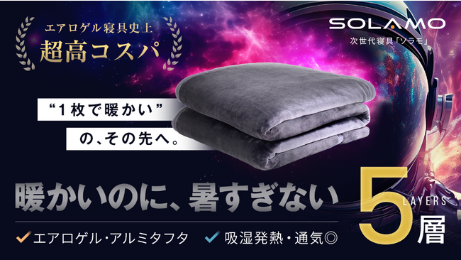 「SOLAMO」では数々のブランケット開発の末の理想の構造「5層レイヤー構造」により、断熱保温機能もさることながら吸湿・通気性機能を搭載し「しっかり暖かい×暑くなりすぎない」寝具を実現しました。