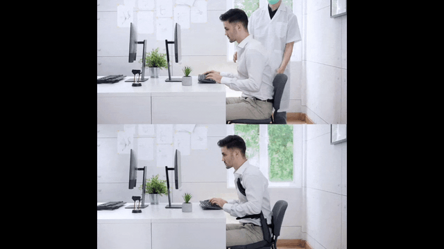 ENYWAREは自動的に「ゼロストレス」の姿勢を作れます。又パソコンやノートパソコンを使用する人をサポートすることができます。前かがみの姿勢が発生するとき、ENYWAREは使用している人をサポートし、「ゼロストレス」の姿勢までにもどります。