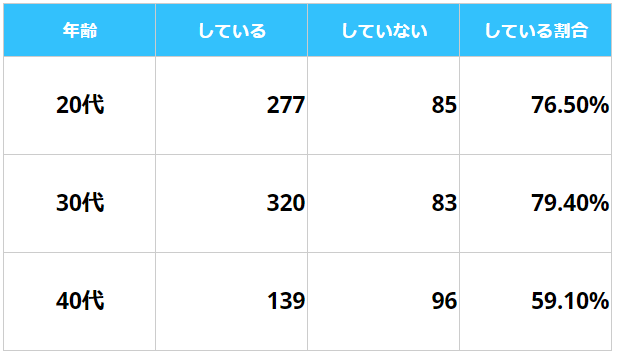 20代~30代の若い世代では、スキンケアをしている人が多く、40代の男性では少なくなりました。それでも40代の60%近くがスキンケアをしており、男性でもスキンケアが当たり前になってきているようです。