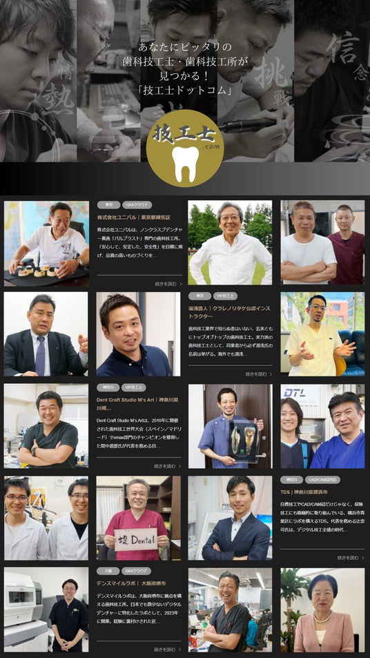 全国の技工所情報をもとに、エリアや得意な技工物等から技工所を探せる検索機能の他、技工所の経営者やエース技工士のインタビュー記事、技工士会からのお知らせ、歯科・歯科技工業界に役立つ情報やさまざまな記事等を発信する業界最大規模の専門Webメディアです。