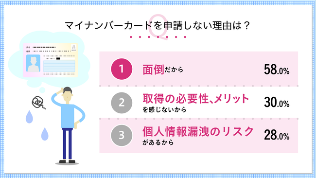 マイナンバーカードを未所有の方(N=200)に申請していない理由を聞いたところ、「面倒だから(58.0%)」が1位となり、過半数が申請の手間によるものと判明しました。続いて、2位「取得の必要性、メリットを感じないから(30.0%)」3位「個人情報漏洩のリスクがあるから(28.0%)」とメリットやリスクの観点から申請していないことが明らかになりました。