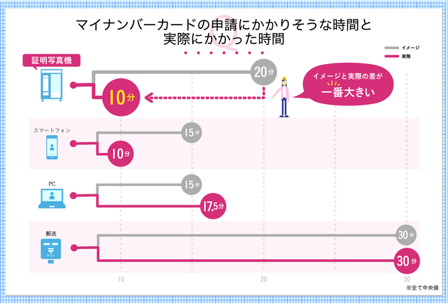 手段別の申請作業にかかる時間のイメージと実際で最も差があったものは「証明写真機」。