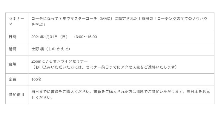 TCA会長士野楓コーチの著書『コーチはプレゼンス』の上梓にあたり、来る1月31日(日)にオンラインセミナーを開催いたします。