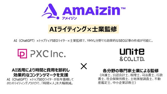 士業コミュニティを企画運営するunite株式会社(本社:東京都千代田区、代表取締役:角田行紀)は、Pioneer of AI/SPを標榜し、セールスプロモーション業界のDXを牽引するPXC株式会社(本社:東京都台東区、代表取締役社長:菅野健一)と事業提携を行うことにより、「AIによるSEO記事作成×士業監修」を実現します。