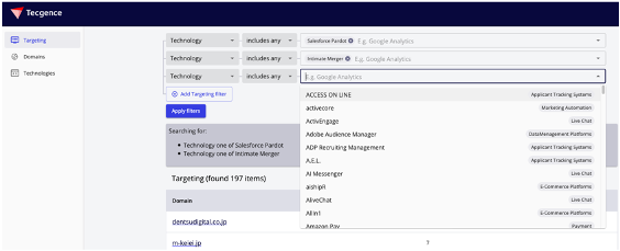 業界経験の長いR&Dチームが高度なスクリーピング技術でテクノロジー固有のコードを自社データベースとマッチングし、ドメイン内の採用・削除のテクノロジーを抽出。