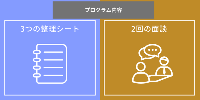 キャリアクリアは3つのワークシートと2回の面談(各60分)で成り立っています。