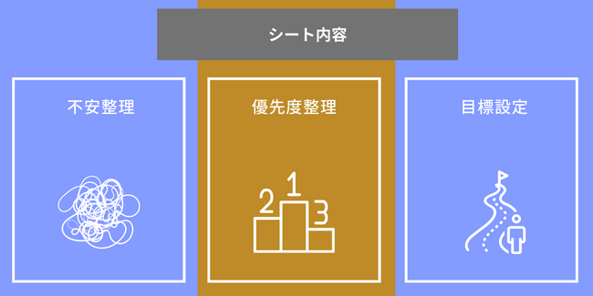 自分の仕事/キャリアについての、不安/優先順位/目標を整理できるシートの活用をできるようになることで、キャリアをクリアに考えられるコンパスを手に入れられます。