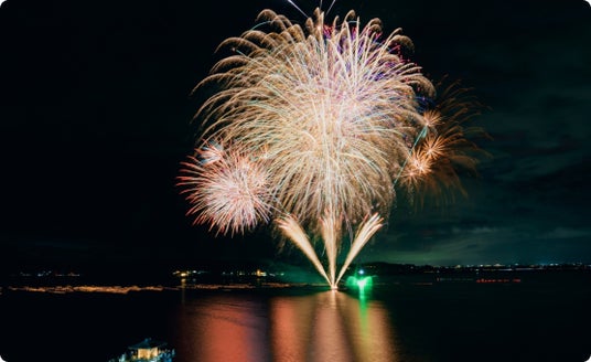伝統的な日本の花火が夜空を彩ります。毎年8月に開催される「片山津納涼花火まつり」片山津温泉の中心部にある「湯の元公園」から「浮御堂」に出て眺める花火は絶景です。満天の空を彩る華麗な花火を、うちわ片手に思い思いお楽しみください。