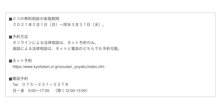 2021年3月31日(水)までの期間限定で、「オンライン法律相談」と「新型コロナウイルスに関連した法律相談(面談)」を無料で実施しています。京都弁護士会ホームページからのご予約が便利です。