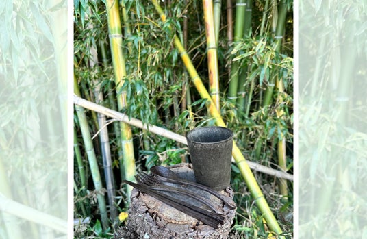 トマトの葉や茎から作った植木鉢と、竹の端材から作ったカトラリーセットとコップ