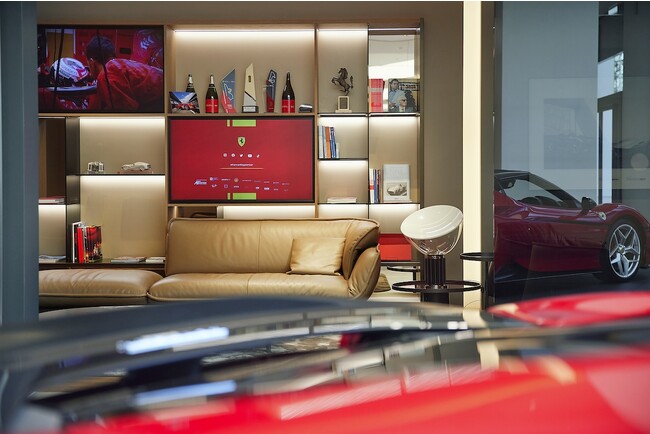 フェラーリはF1の歴史始まって以来、70年間出場し続けてきた唯一無二のブランドです。そのF1を始めとしたモータースポーツにおける豊かなヘリテージを美しく展示しています。ショールームの奥にウォールマウントされたモニターでは、最新モデルのムービーや毎年開催されるフェラーリ主催のツーリングイベント、カヴァルケードの壮観な光景などブランドの過去と未来にまたがるムービーコンテンツをご堪能いただけます。