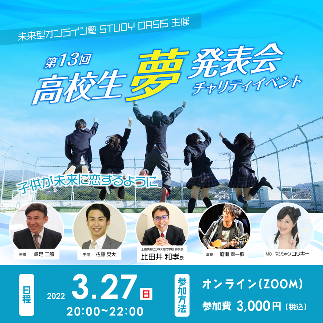 株式会社CRERIA(クレリア、福島県南相馬市、代表取締役 佐藤晃大)が運営する、北海道から沖縄まで生徒を持つ中高生向けオンライン学習塾「STUDY OASIS(スタディオアシス)」が主催となる、「第13回高校生夢発表会チャリティイベント」を2022年3月27日(日)にZoomを利用したオンラインにて開催いたします。