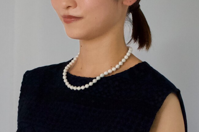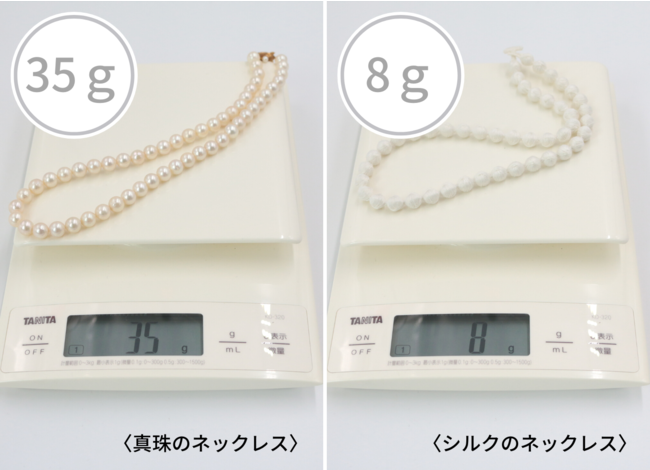 同じ長さの真珠のネックレスが35gに対して、シルク糸で出来たスフィアシルクベーシックの重さは約8g。そのため一日中身に着けていても体に負担をかけません。