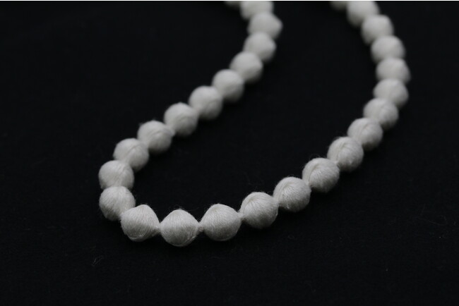 パールネックレスのようなシンプルなデザインをシルク糸で表現しました。シルクならではの上品な光沢と、わずか8gの軽さが特徴で、ハレの日やフォーマルシーンでも活躍する、トリプル・オゥの新定番アイテムです。