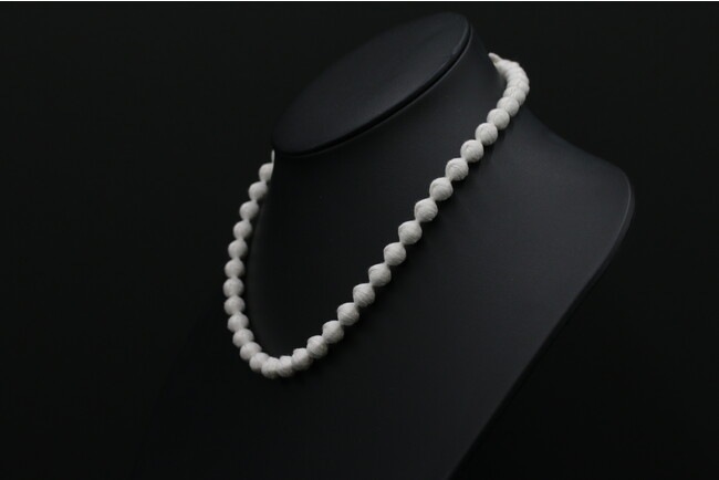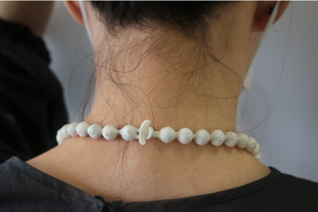 留め具までシルクの糸なので、金属アレルギーにも対応。身に着ける人へのやさしさにこだわったネックレスが誕生しました。